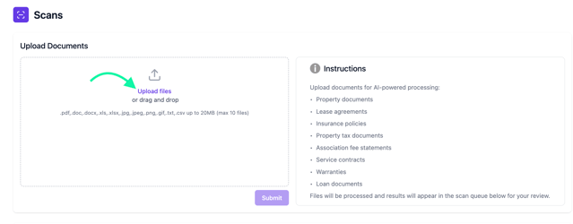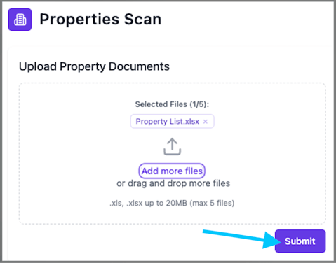 Choose Upload Files or Drag and Drop your Files to upload your Exel or .csv file. Then choose the Submit option to begin processing your scans once the upload is complete: