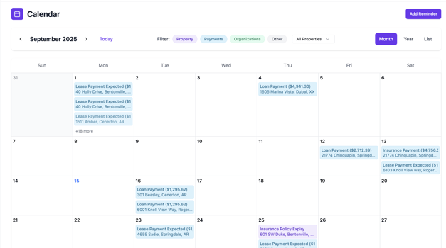 The Calendar module shows every upcoming due date and event from across your account—automatically generated from leases, loans, taxes, and more.