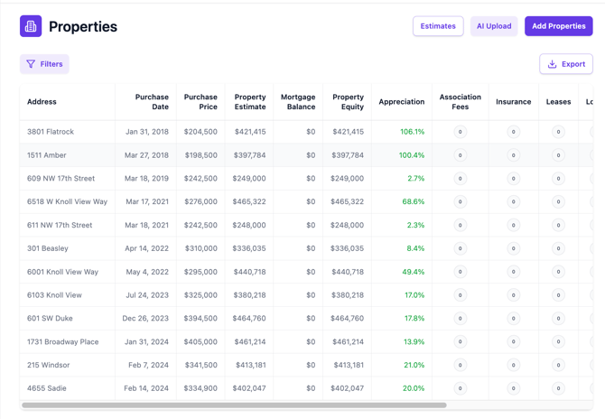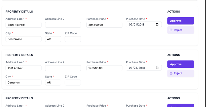 Once your file is processed, verify that all property details are correctly populated. Edit any information as needed, then select Approve to add each property to your portfolio.